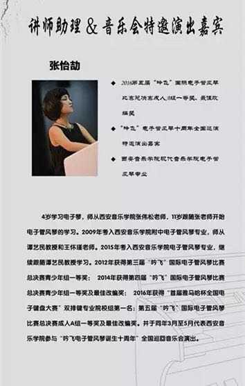 本次活動,除了精彩的師資培訓(xùn)外,主辦方還特別安排了一場精彩地音樂會活動。音樂會上特別邀請到張怡劼作為音樂會的演出嘉賓,張怡劼在西安音樂學(xué)院跟隨譚藝民教授學(xué)習(xí)電子管風(fēng)琴。多次在國際比賽中拔得頭籌~培訓(xùn)過程中她也擔(dān)任了講師助理協(xié)助馮捷老師共同完成授課。