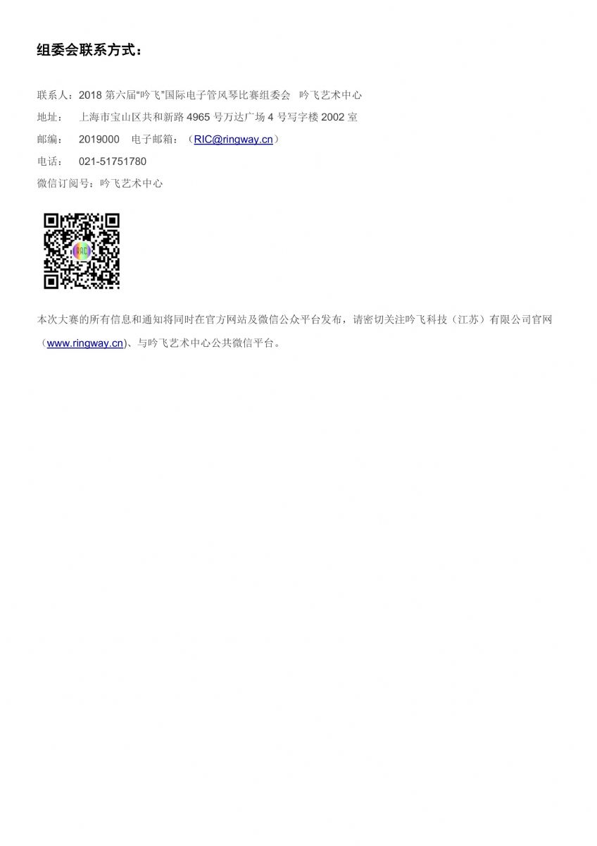 聯系人:2018第六屆“吟飛”國際電子管風琴比賽組委會 吟飛藝術中心(工作時間:周一至周五 早9:30—晚17:30)
