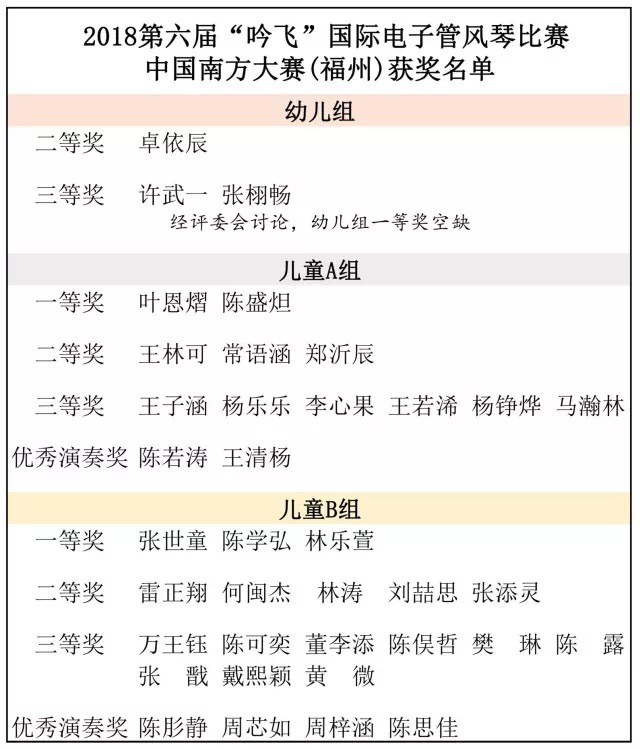 【獲獎名單·福州】2018第六屆“吟飛”國際電子管風琴比賽