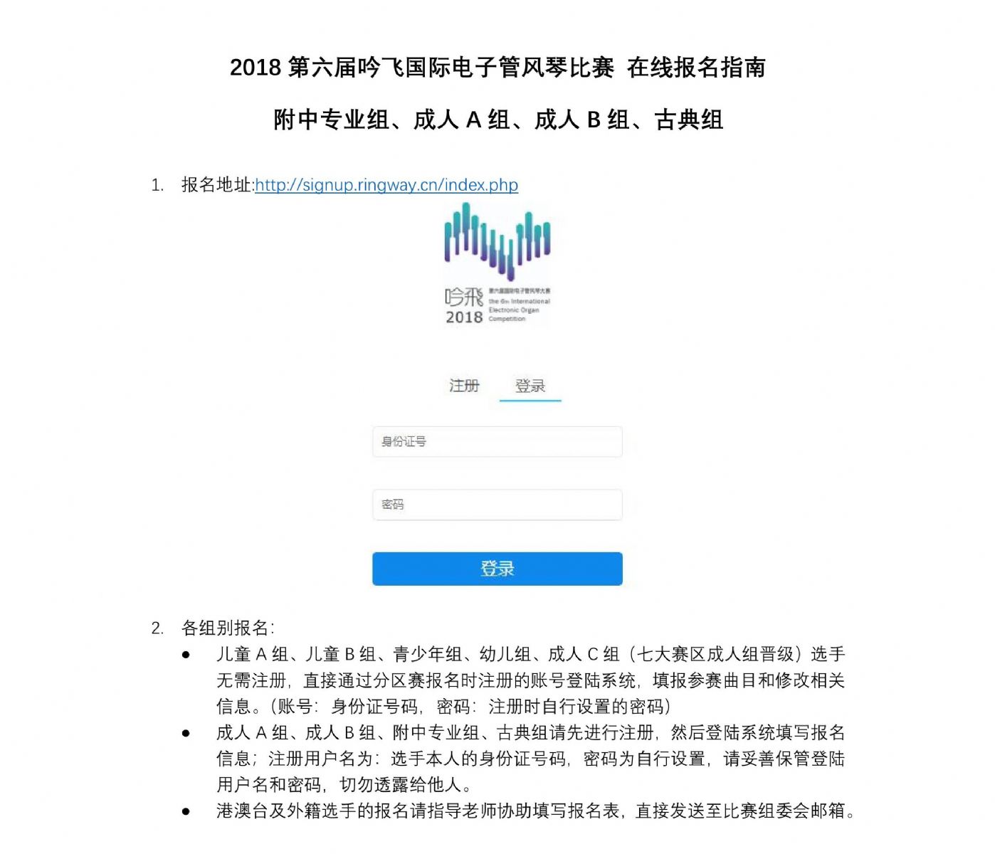 2018第六屆“吟飛”國際電子管方琴比賽總結賽將于6月15日—6月22日報名,請參加比賽的選手盡快報名,此次報名依舊采取網上在線報名,專業組和分賽區晉級選手可在報名專區進行報名,港澳臺及海外選手下載報名表(見附件)并提交至RIC@ringway.cn進行報名。